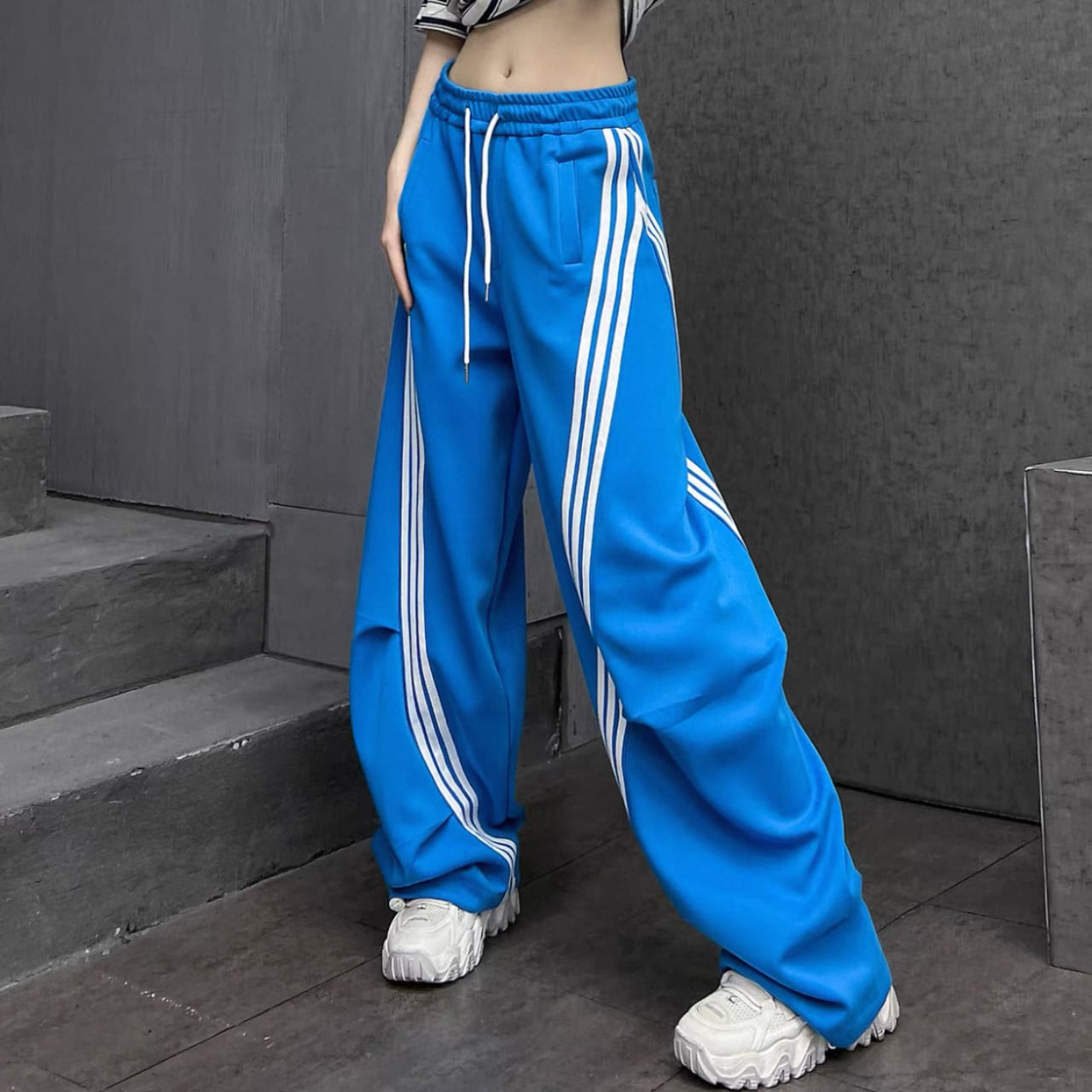 ドローストリングデザインのワイドパンツは、スタイリッシュなサイドラインが特徴です。