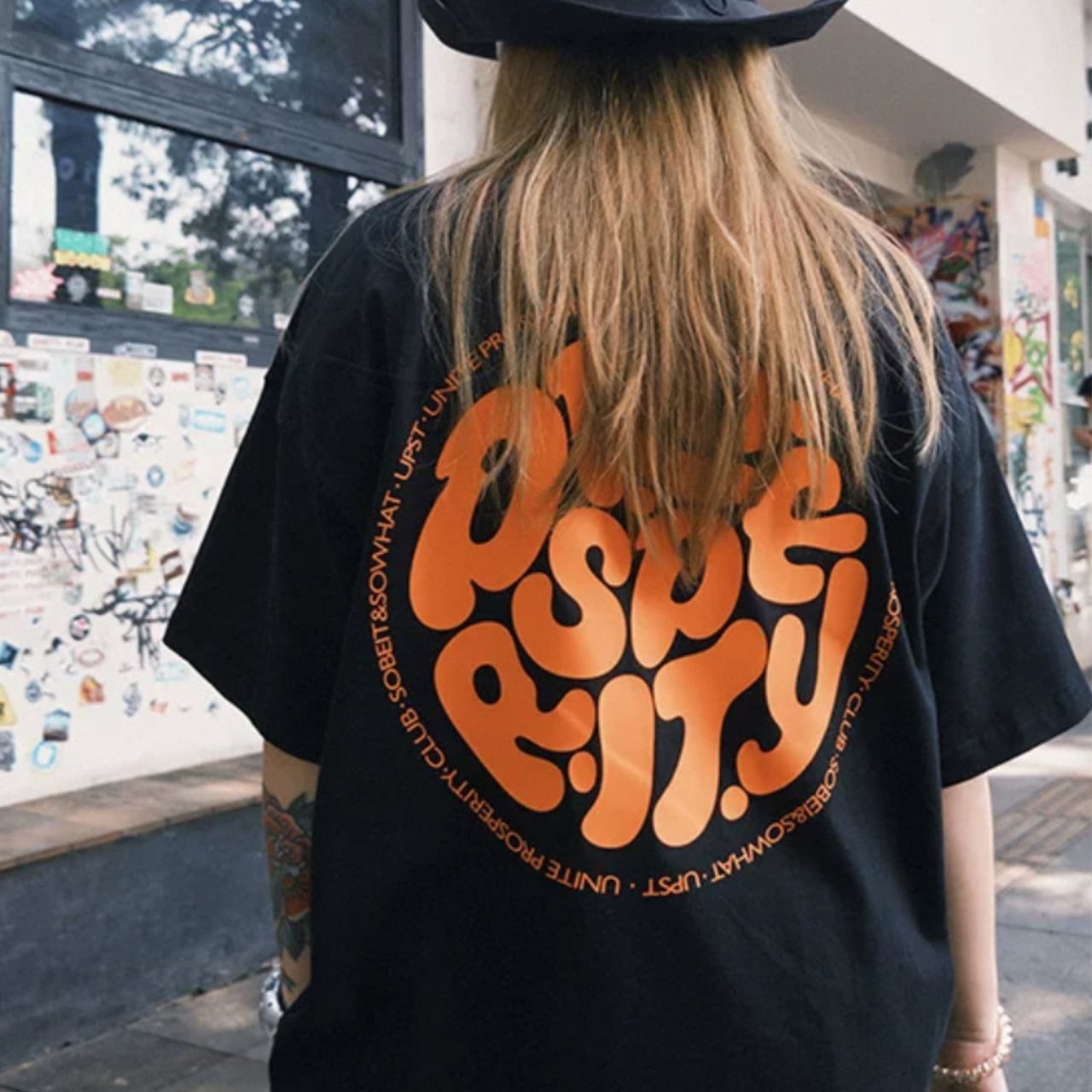 バックプリントが目を引くオーバーサイズシルエットの半袖クルーネックTシャツ。