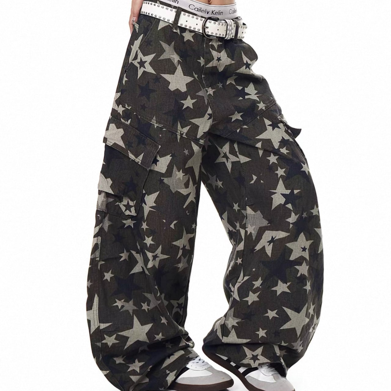星柄が目を引くワイドパンツ。フルレングスで、ストリートスタイルやカジュアルな着こなしにぴったりです。