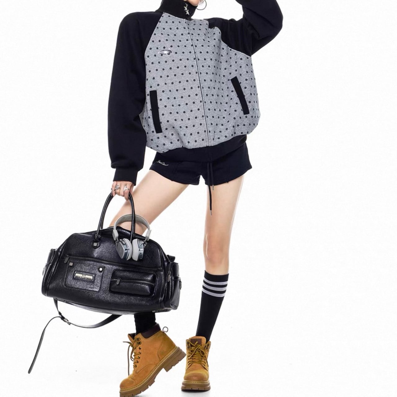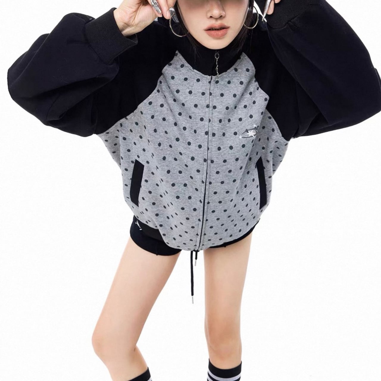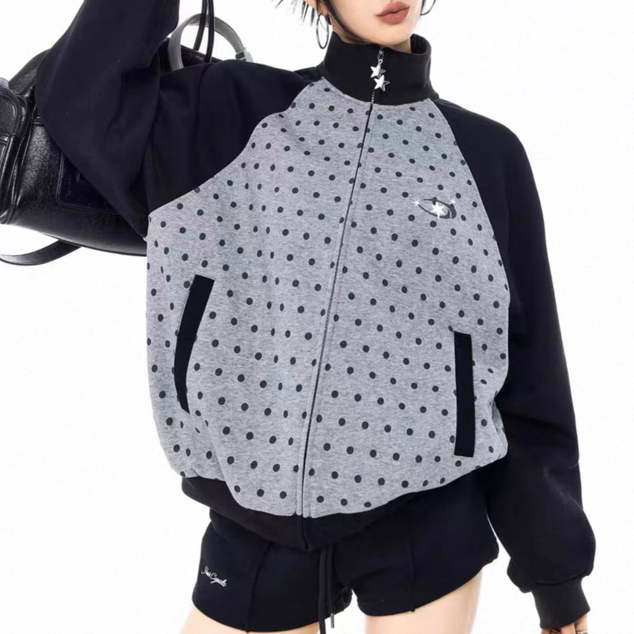 ドット柄の切り替えデザインが目を引く、フルジップブルゾン。