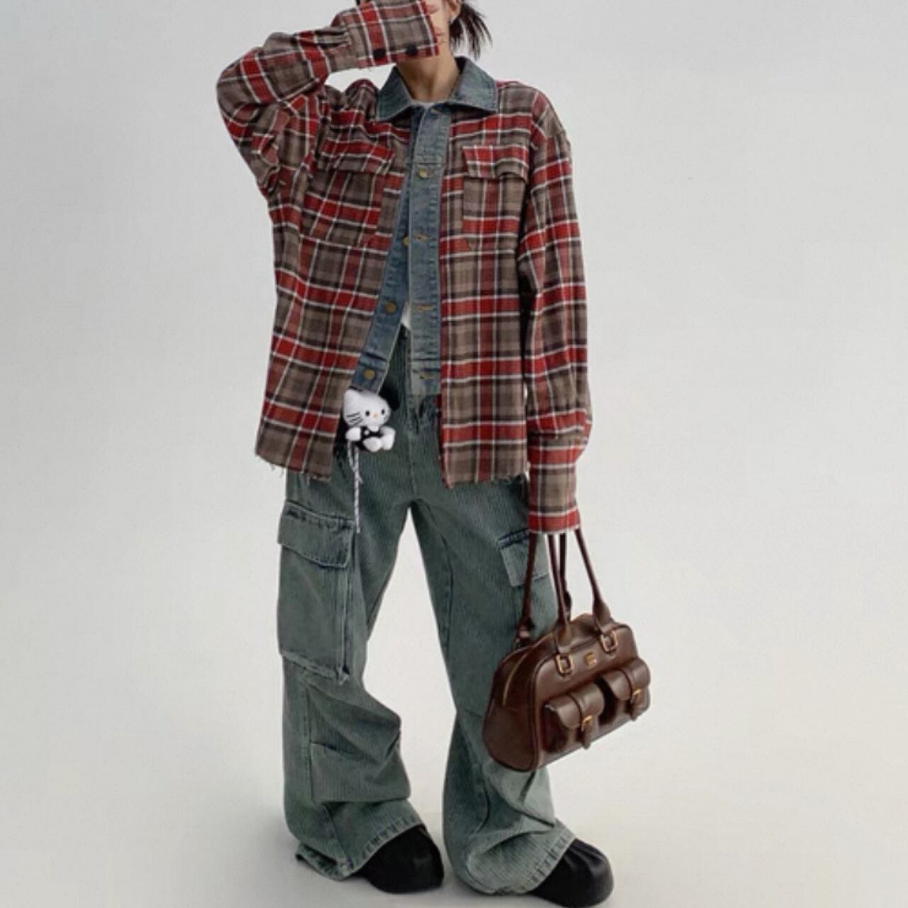 チェック柄とデニムの切り替えが目を惹くオーバーサイズシャツジャケット。